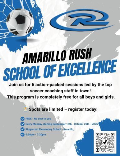 Amarillo Rush's player-centered approach, backed with a national-level program and elite-level coaching, provides a positive playing and learning environment that fosters long-term player development and personal growth. We strive to provide our players with the highest quality soccer training and development in America. Rush provides top-quality opportunities for players at all levels. The club employs talented full-time and part-time coaching staff with vast experience of the youth soccer across the US and the world. The quality of coaching is a major factor in the playing success of the club.